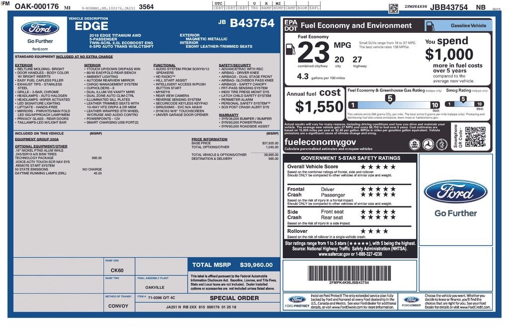 2018 Ford Edge Titanium AWD Magnetic EcoBoost 2.0L I4 GTDi DOHC Turbocharged VCT Edge Titanium, 4D Sport Utility, EcoBoost 2.0L I4 GTDi DOHC Turbocharged VCT, 6-Speed Automatic, AWD, Magnetic, Ebony Leather. 20/27 City/Highway MPG