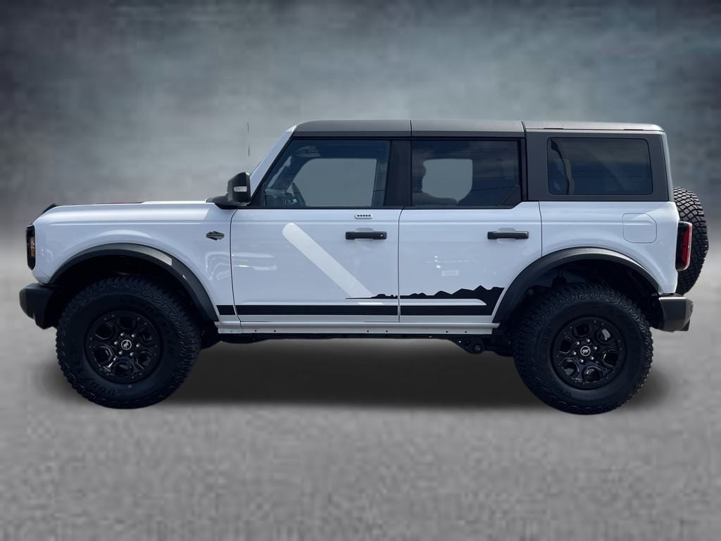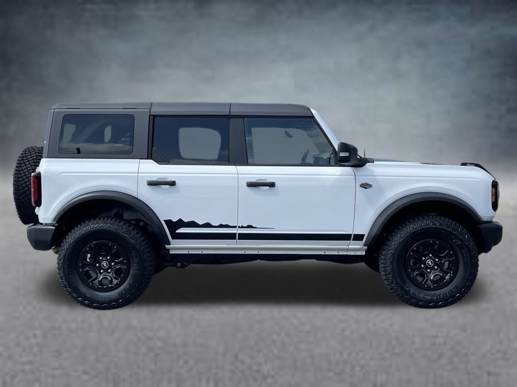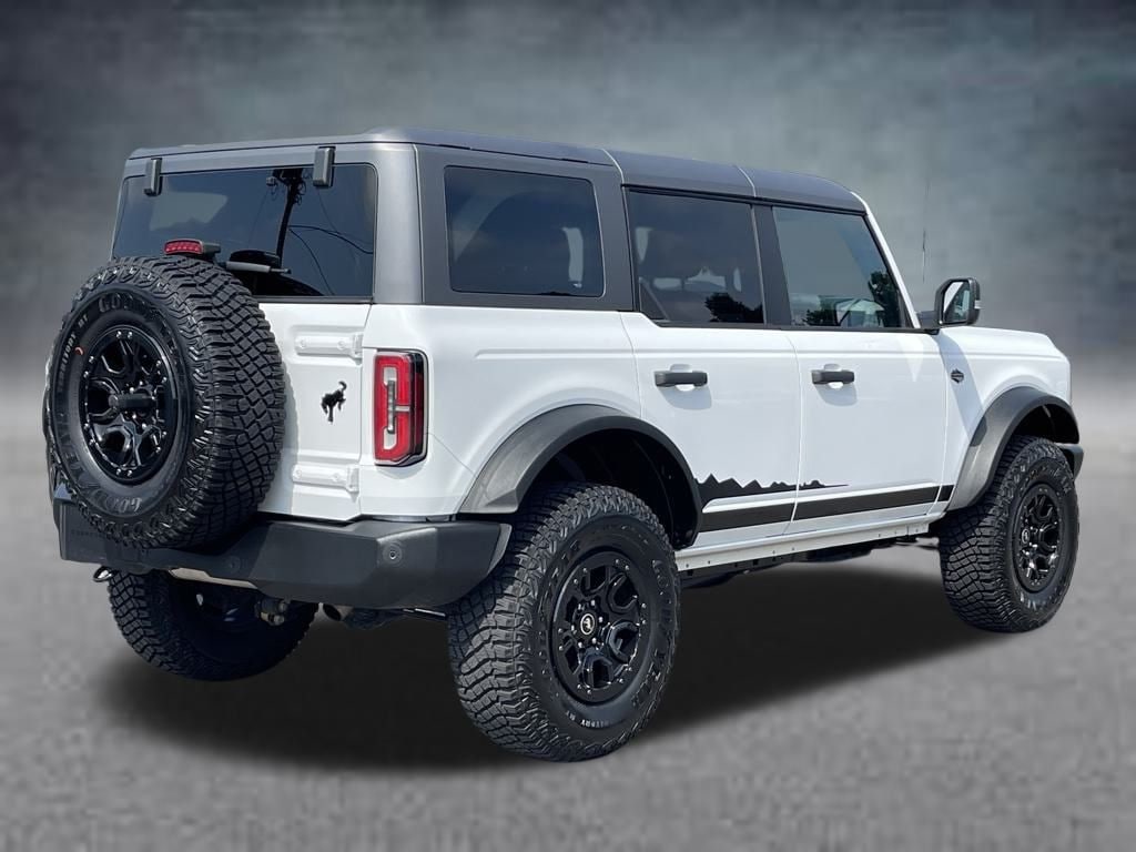 The 2022 Ford Bronco Wildtrak in Oxford White is a rugged yet refined 4WD SUV equipped with a robust 2.7L EcoBoost V6 engine and a smooth 10-speed automatic transmission. Its exterior combines toughness and style, while the interior features a sophisticated blend of Medium Sandstone and Black Onyx cloth bucket seats that offer comfort for off-road adventures or daily driving.