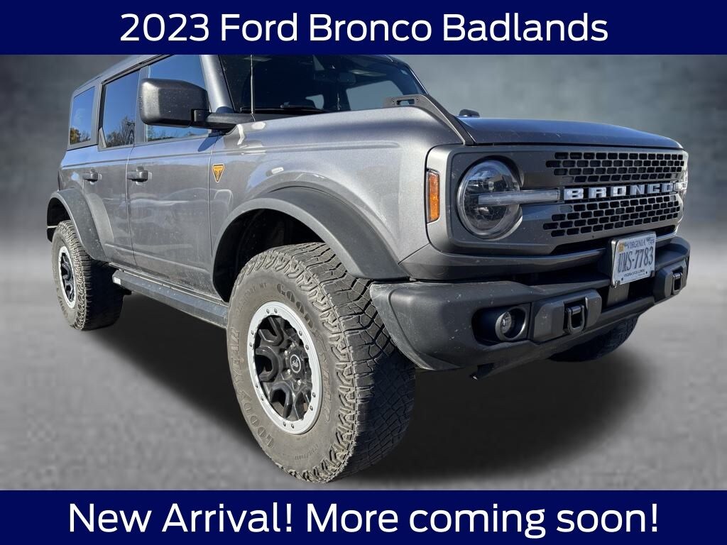 2023 Ford Bronco Badlands 4WD Carbonized Gray Metallic 2.7L EcoBoost V6 4D Sport Utility, 2.7L EcoBoost V6, 10-Speed Automatic, 4WD, Carbonized Gray Metallic, Black Onyx w/Marine Grade Vinyl Bucket Seats, ABS brakes, Compass, Electronic Stability Control, Heated door mirrors, Illuminated entry, Low tire pressure warning, Remote keyless entry, Traction control.