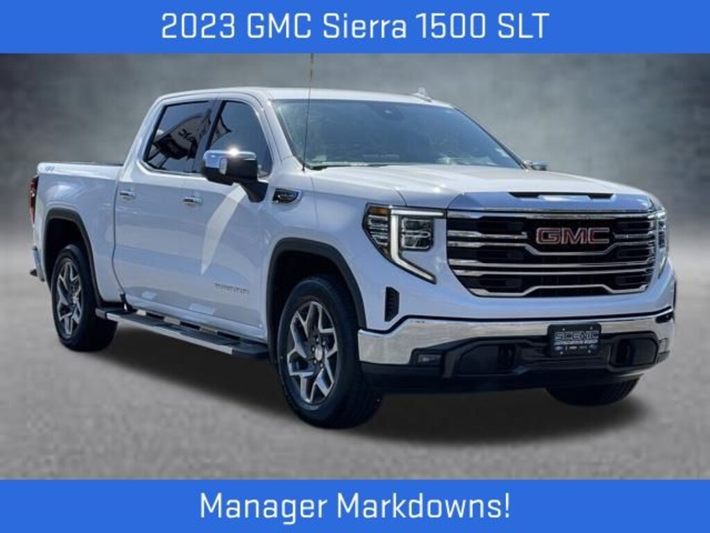 The 2023 GMC Sierra 1500 SLT in Summit White is a capable full-size pickup that balances performance, comfort, and technology. Powered by a 5.3L EcoTec3 V8 paired with a 10-speed automatic transmission and four-wheel drive, it provides strong towing and hauling capabilities, further enhanced by the auto-locking rear differential, auxiliary transmission cooler, and the trailering package.