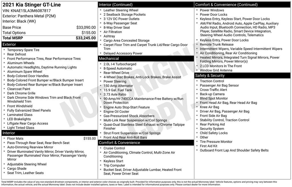 2021 Kia Stinger GT-Line RWD Panthera Metal 2.0L I4 Turbocharged DOHC 16V LEV3-ULEV125 255hp 22/29 City/Highway MPG
